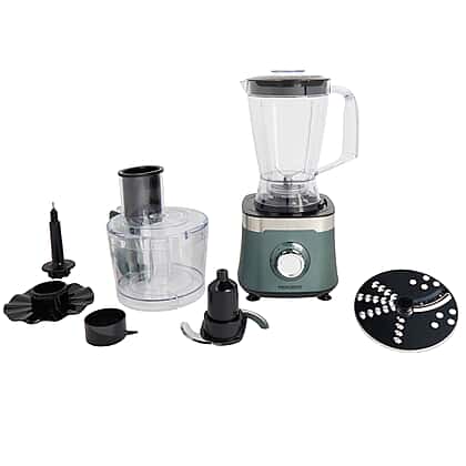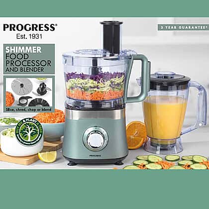 Revolutionise your kitchen with the Progress food processor & blender set from the Shimmer range, your all-in-one solution for preparing a variety of dishes with ease. This stylish green machine has everything you need for shredding, slicing, chopping, kneading dough, and emulsifying, boasting an 800 W motor for powerful performance. The set includes a large 1.5 L bowl and a 1.4 L jug to cater to all your meal prep needs, complemented by two-speed settings and a pulse function for complete control.