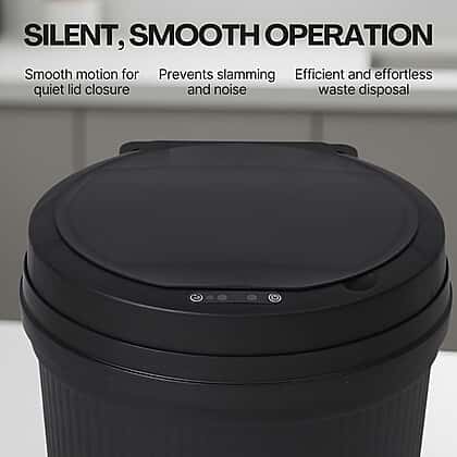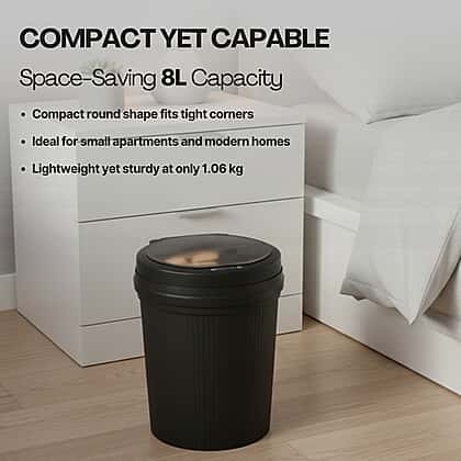 Upgrade your everyday routine with this 8L smart bin with an infrared sensor for automatic opening and closing. Designed for hands-free convenience, the bin opens automatically when it senses movement—ideal for maintaining hygiene in kitchens, bathrooms, and bedrooms. Made from a durable mix of ABS, HDPE and PP, it’s lightweight yet sturdy at just 1.06kg. The round, space-saving shape fits neatly into compact spaces, and its sleek black finish suits modern interiors. Powered by 2 AA batteries (not included), it’s easy to set up and operate. A folding lid ensures quiet, efficient closing, making waste disposal cleaner and more effortless.