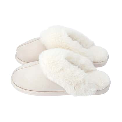 Suede Home Slippers with Faux Fur Ivory