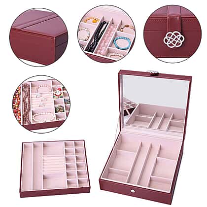 Two-Layer Burgundy Jewellery Box with Multiple Compartments and Mirror