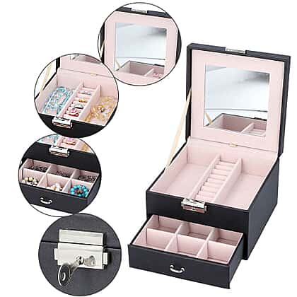 2 layer Jewellery box with Lock and Key Mirror, Jewellery Organiser Box for Rings Earrings, Watches, Necklace, Bracelets and Travel Jewellery Storage Case Pu Leather Birthday Wedding Anniversary Jewellery Gift Box for Women Girls