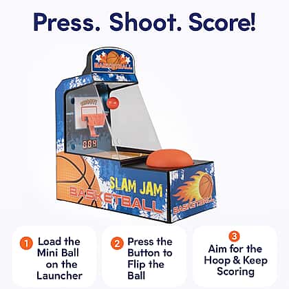 The Slam Jam Basketball Game is a fun toy for children that allows them to learn while they are having fun. The Retro Arcade kicks in when you start pushing the button on the base to flip the ball and throw it at the basket. The Basketball Game is a great indoor fun designed for gifting purposes.