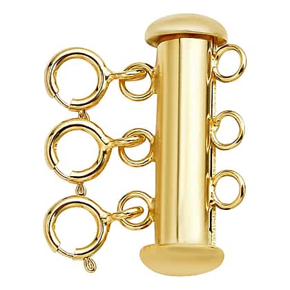 Enjoy the new way of layering your favourite chain or necklace with this three-row magnetic layering lock. Creating three layering combinations, this magnetic tube lock is suitable for stacking multiple strands of necklaces or bracelets. Made of sterling silver with a yellow gold overlay, this lock keeps the layered chains from getting tangled while wearing. Once all the chains are attached, it is easy to take all the chains on and off at the same time by sliding the barrel in or out. The necklace separator is a clasp on its own - it opens by pulling the tubes apart and closes by sliding them back together - the smaller tube slides into the larger one. In addition, one side has loops to attach your necklace’s clasps onto and the other side has spring clasps - to attach to the ring end of your necklace.