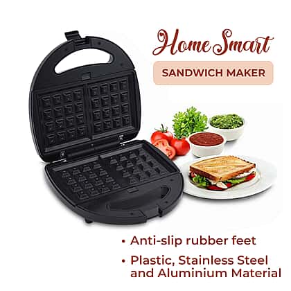 Home smart brand sandwich maker with three sets of detachable heating plates comes with a sandwich, waffle, grill plate and Removable non-stick plate surface for easy clean-up. Handles are designed to open and close quickly or taken anywhere, With red and green light indicators. Features overheat protection function with lock clip and cord storage function to minimise the storage space. Anti-slip rubber feet that prevent it from slipping. Made of durable plastic, stainless steel, and aluminium material for prolonged use and it is powered by a BS plug and comes in a size of 24x23x9 cm.