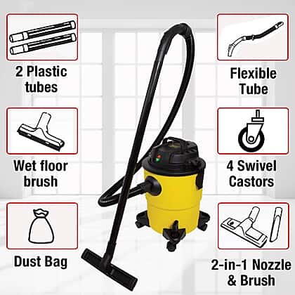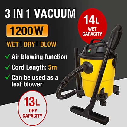 - HIGH CAPACITY: The vacuum runs on 1200 watts of power with a capacity of 13 and 14 litres of dry and wet vacuuming