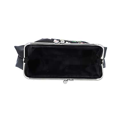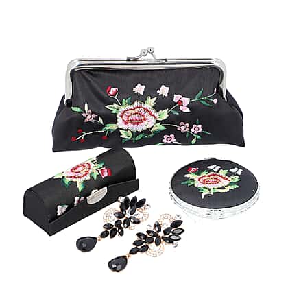 4 Piece Set- Peony Flower Embroidered Coin Purse, Dual Sided Compact Mirror, Lipstick Case and Simulated Black Spinel with White Crystal Studded Chandelier Earrings (with Push Back) in Gift Box- Black