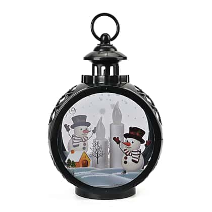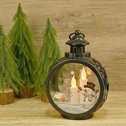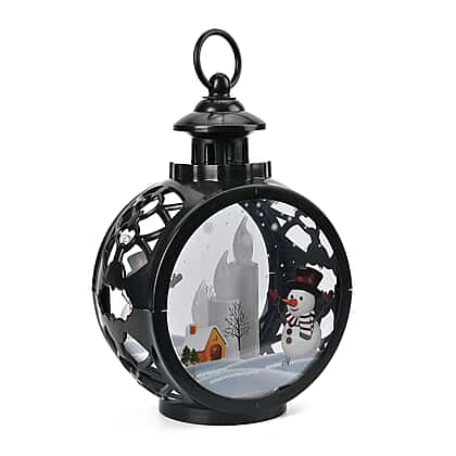 Vintage Clock Shaped Carved With Santa & Snowman Hanging Lantern LED Light (3xAAA Batteries, Not Incl.) - Black
