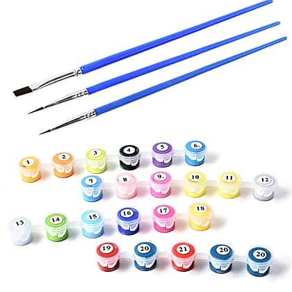 - ACCESSORIES: You get three paintbrushes, one canvas piece with the pre-numbered and pre-drawn art form, paint and canvas