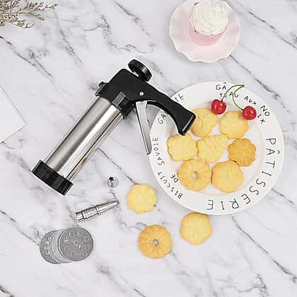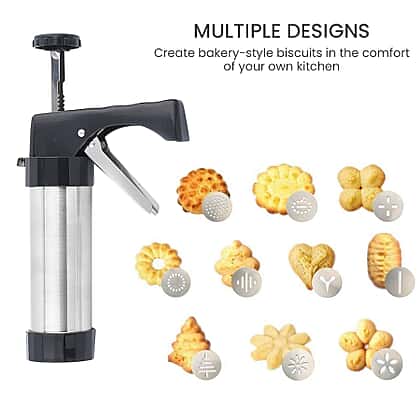 Cookie Maker with 6 Cake Piping Nozzles and 10 Biscuit Stencils in Stainless Steel - Silver and Black