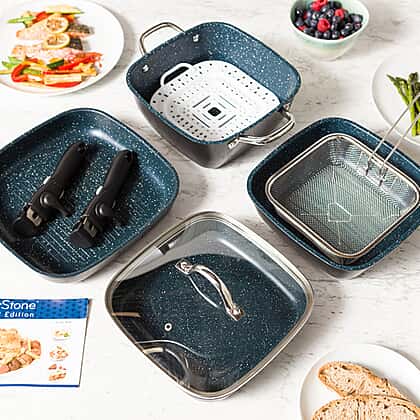 FlavorStone Diamond - 24cm Deep Pan, 24cm Saute Pan, 24cm Casserole Pot, 28cm Grill Pan, Tempered Glass Lid With Steam Vent, Detachable Handle, Cooking Basket, Silicone Steamer and Recipe Book