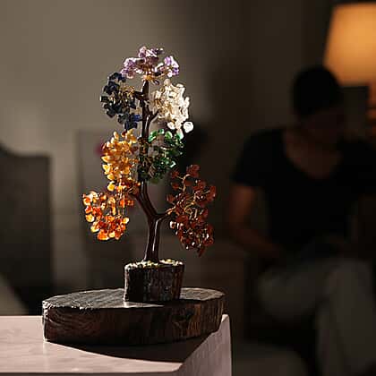 Elevate your home with this unique handmade multi-gemstone decorative tree. Crafted under expert guidance, the decorative is accompanied by a wooden base and has multi-colour gemstones wired together, making seven coloured branches of this decorative tree. Wrap fairy lights around this piece for a glowing look.