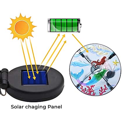 - DESCRIPTION: A unique, long-lasting hand-painted mermaid design table made of glass and metal with solar function, which turns it into a glowing paradise at night