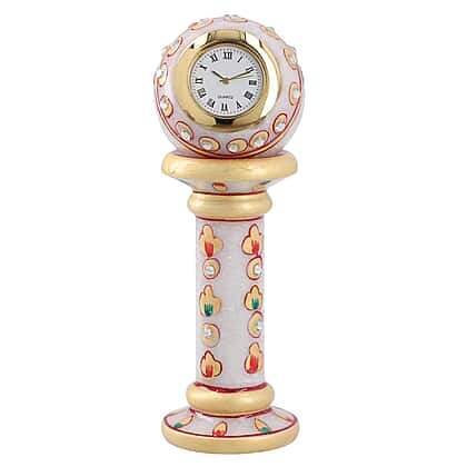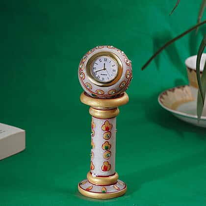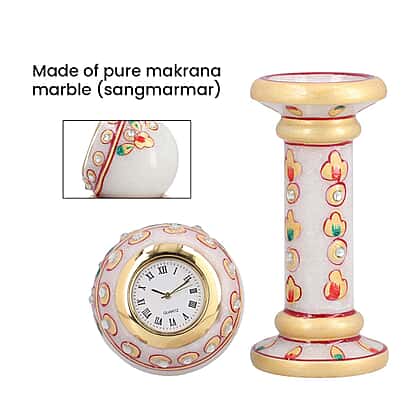 Handcrafted Makrana Marble Table Clock with Rajasthani Hand Enamelling (Size 15x5 Cm) - White