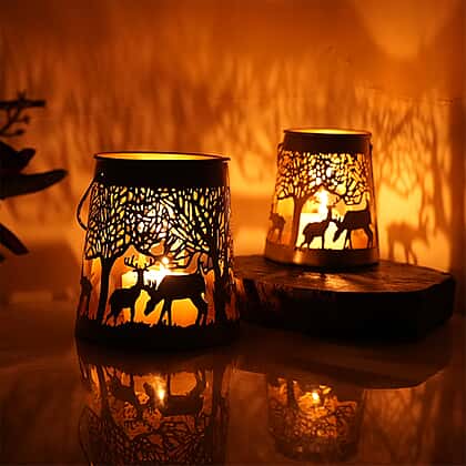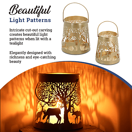 Add a touch of enchantment to your space with our Set of 2 Stunning Metal Etched Reindeer Pattern Hanging Lanterns. Crafted with intricate reindeer patterns, these lanterns create a magical ambience, perfect for the holiday season. Made with high-quality metal, they ensure durability and long-lasting beauty. Hang them indoors or outdoors to elevate your decor and embrace the festive spirit.
