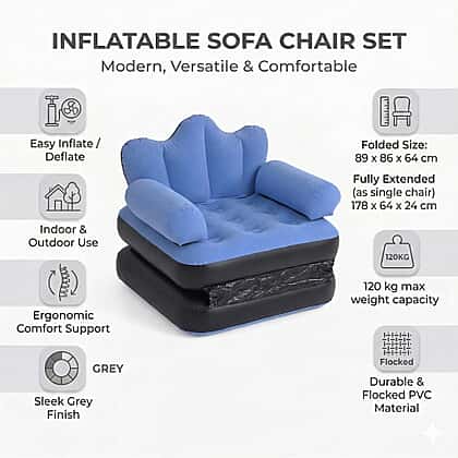 Experience comfort that adapts to your space with this inflatable reclining sofa bed, designed for relaxed lounging and practical versatility. The cushioned seating offers a supportive feel, while the extended base transforms easily into a laid-back resting position. Finished in a blue tone, it blends seamlessly into both indoor and outdoor settings. The lightweight, inflatable construction allows for quick setup and easy storage, making it ideal for flexible living. Whether used for casual seating, reading, or occasional sleeping, this design delivers convenience without compromising on comfort.