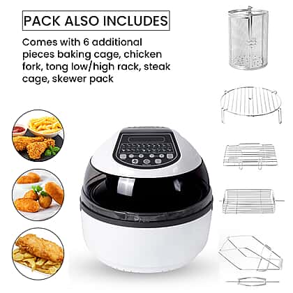 - PACK ALSO INCLUDES: The air fryer comes with a backing cage, chicken fork, tong, low and high rack, steak cage and a skewer pack, all aiding you to prepare a variety of dishes