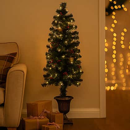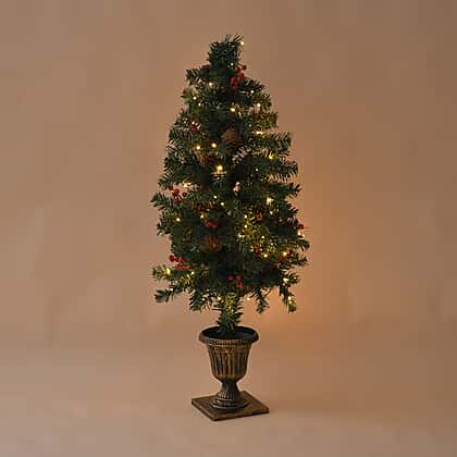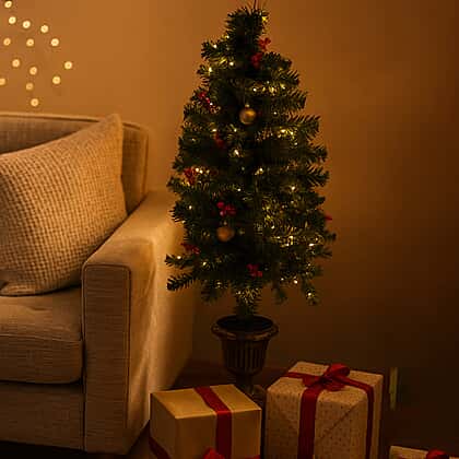 Bring the festive spirit to life with this lush green artificial Christmas tree. Adorned with 16 pinecones, red berries, and pre-lit with 100 warm LED lights, it features 100 pointed tips for a vivid, lifelike appearance. The full-bodied branches and high-quality PVC material ensure the tree is durable, low-maintenance, and reusable for years to come. Complete with a stable wine cup-style plastic base, it’s quick and easy to set up. Perfect for enhancing fireplaces, porches, hallways, windowsills, or any living space, this 120cm decorative tree adds charm and warmth to your holiday décor.