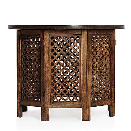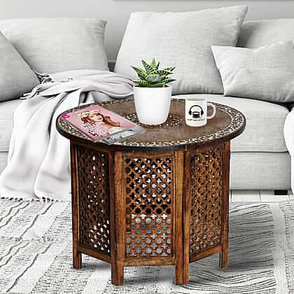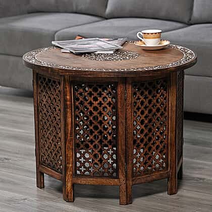 NAKKASHI - Hand Carved Solid Mango Wood Round Table in Natural Finish (Size 51x68 Cm) with Jali Knock Down Stand- Dark Brown
