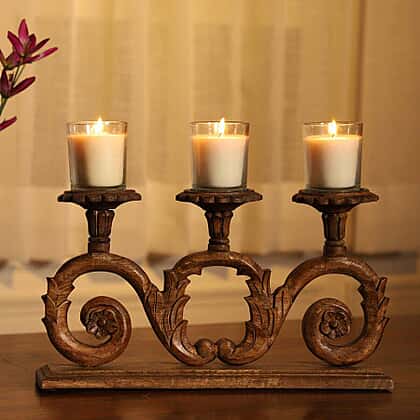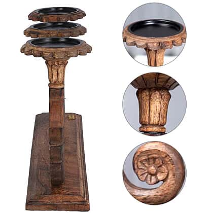 NAKKASHI Hand Carved Wooden Candle Stand (3 Candles)