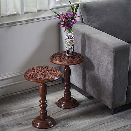 - MATERIAL: The set of 2 wooden carved bedside pillar tables are made from high-quality, durable, versatile and attractive Sheesham wood in a beautiful finish