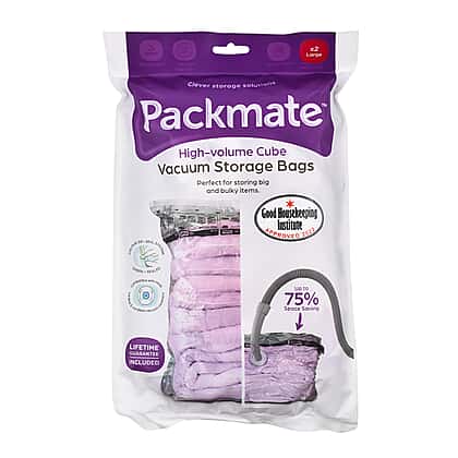 Maximise storage space with the Set of 2 Packmate Large High Volume Cube Vacuum Storage Bags. These innovative bags compress and organise your belongings, freeing up closet, wardrobe, or suitcase space. Store bulky items like comforters and seasonal clothing effortlessly. The vacuum sealer removes air, reducing bag size by up to 80%. Protect items from dust, moisture, and odours while reclaiming valuable space. Experience the convenience of Packmate High Volume Vacuum Storage Bags today.