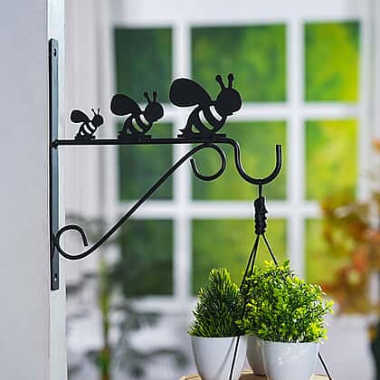 - Set of two hanging basket brackets featuring a delightful honeybee design