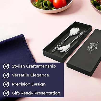 Enhance your dining experience with this exquisite set of 2 Salad Servers, perfect for any culinary enthusiast. Designed with elegance in mind, these utensils make serving salads and pasta a breeze and add a festive touch to your table. The high-quality construction ensures a comfortable grip and precise serving every time. Presented in a sleek black gift box, they make a thoughtful gift for weddings, housewarmings, or any special occasion. Elevate your dining moments and impress your guests with these stylish servers that combine functionality and sophistication effortlessly.