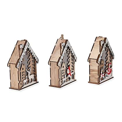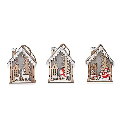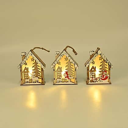 Set of 3 Hanging Christmas Wooden House with LED Warm Lights (Size 12x9x3 cm) - Multi