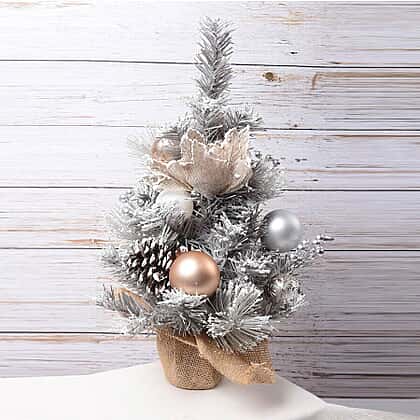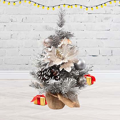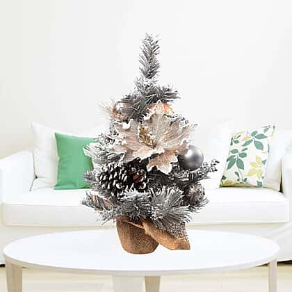 Table Christmas Tree with Snow Flocking, Baubles, Pine Cone (Size 40cm) - Silver and Golden