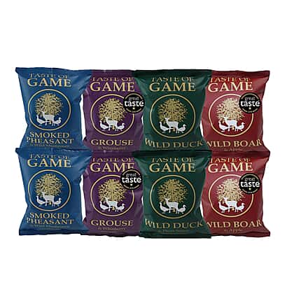 Taste of Game Crisps Variety 8x40g (2 x Wild Duck and Plum Sauce, 2 x Grouse and Whinberry, 2 x Wild Boar and Apple, 2 x Smoked Pheasant and Wild Mushroom)