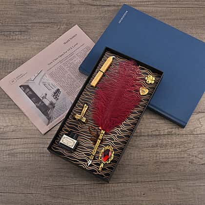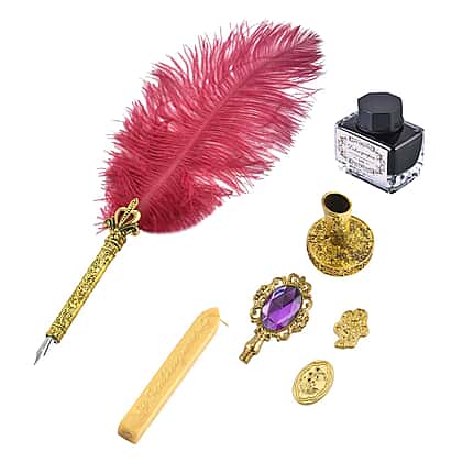 - It includes a quilted feather pen, ink bottle, charms, pen holder and wax stamp