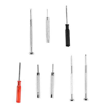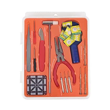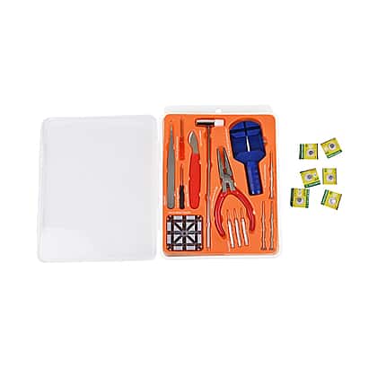 Introducing our versatile watch repair set (20pcs) in vibrant multi-colour. This comprehensive set equips you with the essential watch repair and adjustment tools. With a compact box, it's easy to store and transport. Crafted from durable plastic, steel, and PP materials, this set weighs 330g, making it lightweight and convenient. The set includes a red and black screwdriver, strip holder, small hammer, tweezer, pin punches, screwdrivers, watch band holder, needle nose plier, red knife, and 6 LR626 batteries. It's your all-in-one solution for watch maintenance.