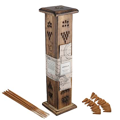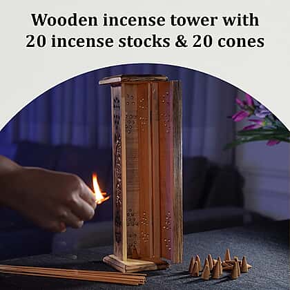 Wooden Incense Tower with 20 Incense Sticks & 20 Cones - Cream