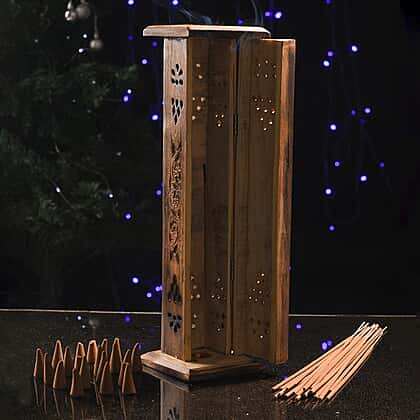 This wooden incense tower with 20 incense sticks and 20 cones is a perfect piece to elevate your home décor look. This box is hand crafted from wood featuring traditional openwork designs and styles from India which allows the fragrance of the incence and cones waft through the holes. It has a space inside the box to keep the cones and place the stick and you can close gate, as it features holes of different diameters. You can use it for spiritual use or while meditating to calm your body, mind and soul.