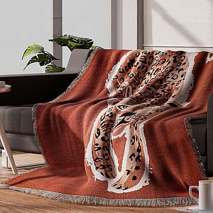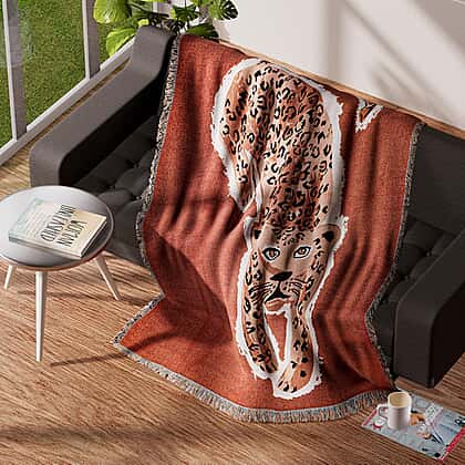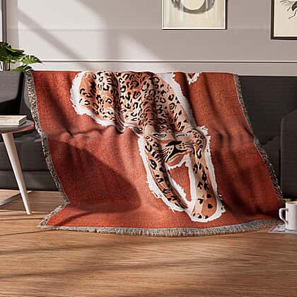 100% Cotton SOHO Design Jacquard Leopard Pattern Woven Throw with Fringes (Size 152x127 Cm) - Rust