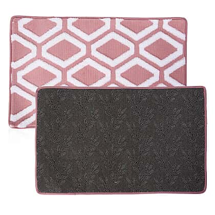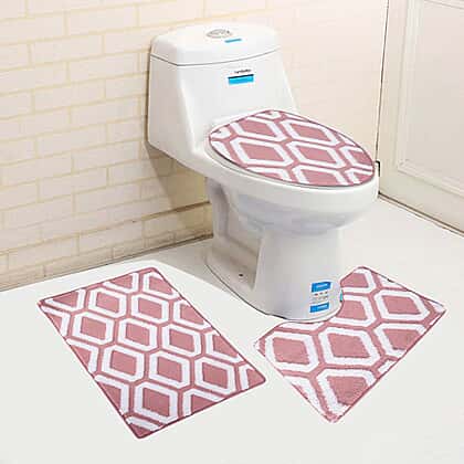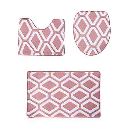 3 Piece Set - Anti-Slip Bathmat (50x80cm), Toilet Seat Cover (40x50cm) and Contour Mat (39x48cm) - Dusty Pink and White Colour