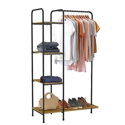 Effortlessly add style and organisation to your space with this multi-functional clothing rack. With its sleek, modern design, this rack blends a sturdy metal frame with wooden MDF shelves to offer both practicality and a stylish touch. With a main clothes rail and four-tier shelving, it’s ideal for hanging and storing clothes, shoes, and accessories. It blends functionality with aesthetics and is perfect for use in your home or a retail shop. Plus, with secure rail stoppers and easy assembly, it’s ideal for tidying your space.