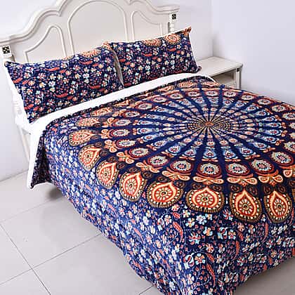 Set of 3 - Microflannel Mandala Printed Comforter in King Size with Sherpa Lining with 2 Sherpa Pillowcases - Navy, Orange and Multi Colour (230x250 Cm)