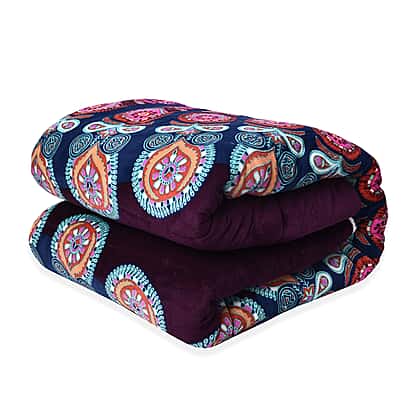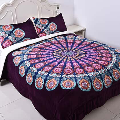 Set of 3 Dark Purple and Multi Colour Microflannel Mandala Printed Comforter in King Size with 2 Sherpa Pillowcases Size 230cm x 250 cm