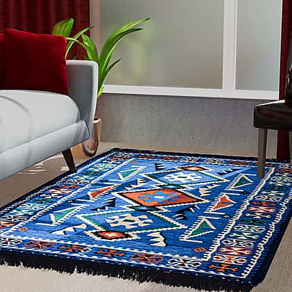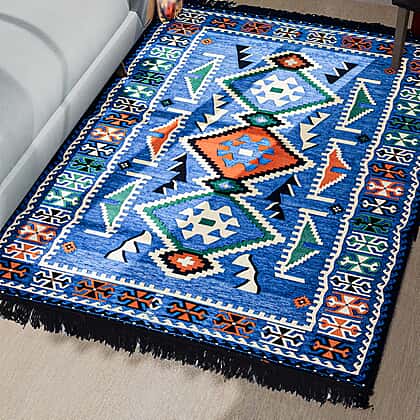 Traditional Turkish Kilim Rug Machine Washable Floor Rug for Porch Kitchen Bathroom Laundry Living Room Throw Rugs Print Tassel Chic Modern Geometric Welcome Door Mat - Blue