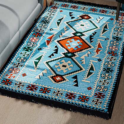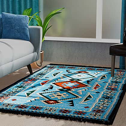 - DESIGN: This exquisite Turquoise Blue Rug comes in geometrical patterns with Tassels on edge, adding a finishing touch to it