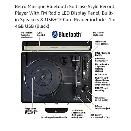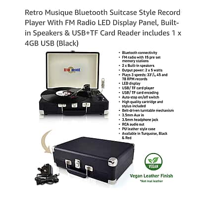 Experience the perfect vintage charm and modern technology blend with the Retro Musique Bluetooth Suitcase Style Turntable. This black retro-style turntable plays your favourite vinyl records and features built-in Bluetooth capabilities, allowing you to stream music wirelessly from your devices. Enjoy your tunes with the convenience of FM radio and the added benefit of a 4GB USB drive, which is included for easy music storage. With built-in speakers, this turntable is ideal for any music lover looking to enjoy a classic listening experience. Its stylish suitcase design makes it portable and perfect for taking your music on the go.