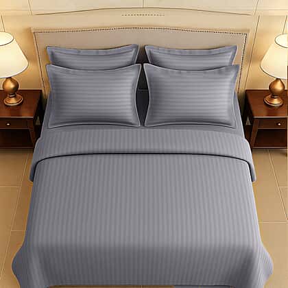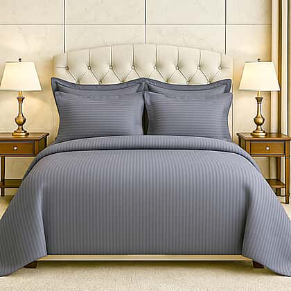 Enhance your bedroom’s contemporary appeal with The Luxe Collection - 6-piece vertical satin stripe duvet cover set in calming grey. Its understated tone brings balance and depth to any décor while maintaining a luxurious feel. The 80% cotton and 20% polyester blend fabric offers both comfort and resilience, keeping your bed fresh and inviting. The subtle satin stripe design lends a gentle sheen and refined detail. This thoughtfully designed double set includes a duvet cover, elasticated fitted sheet, and four matching pillowcases—two Oxford and two Housewife—for a complete, effortlessly modern finish.