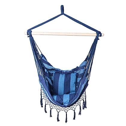 Striped Hanging Rope Hammock Swing Seat with 2 Cushions (Size 100x130cm) - Light and Dark Blue