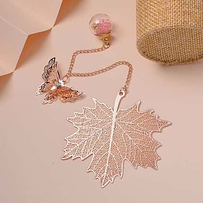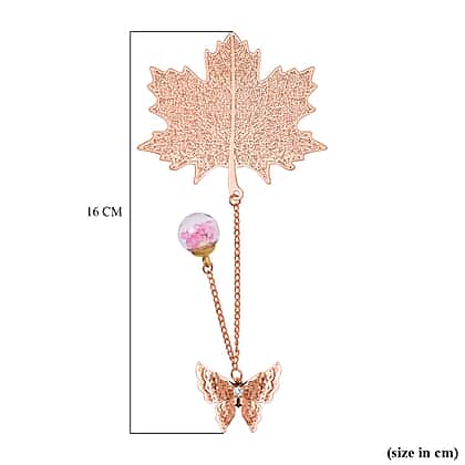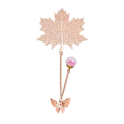Vintage Metal Feather Bookmark with Realistic 3D Metal Butterfly and Eternal Flower Glass Ball Pendant - Rose Gold
