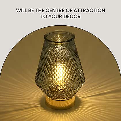 This vase-shaped table lamp will illuminate the darkness and add a charming decoration to your home space. The reflective surface of this lamp is made of high-quality glass, which has a diamond embossed design, providing beauty to your décor. The gold plastic bass holds the light with modernity, and the battery case fits inside. Powered on AAA batteries, the Edison filament bulb adds a vintage touch to this lamp.