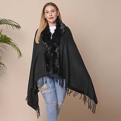 Designer Inspired Faux Fur Trimmed Cape - Black (One Size; 170x77+10cm)
