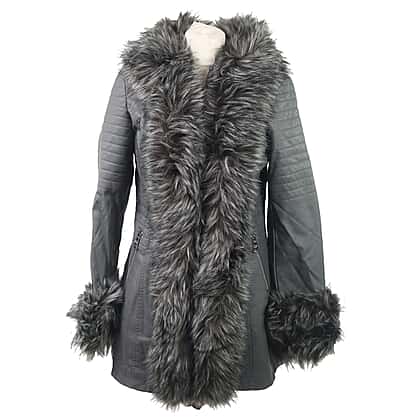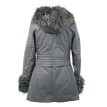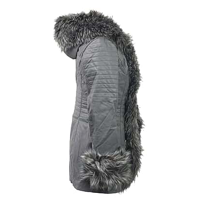 Grey Hooded Faux Leather Jacket with Faux Fur Trim Collar and Cuffs (Size 8)
