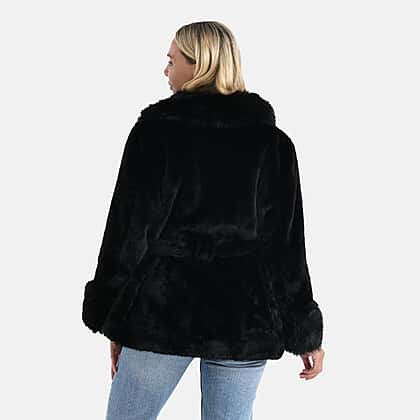 La Marey Luxury Leopard Print Belted Faux Fur Coat (One Size up to size 20 ) - Black