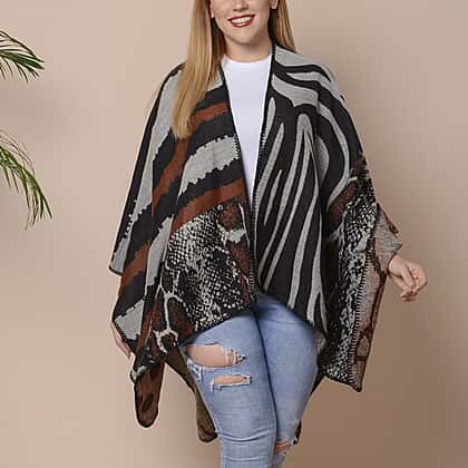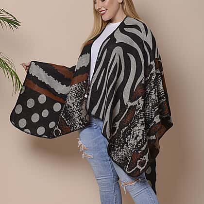 - BOLD PATTERN- Exotic pattern consisting of polka dots, snake-skin prints and stripes provide the Ruana an alluring look